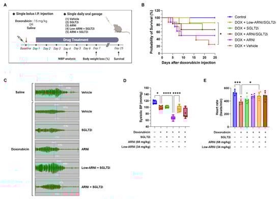 Survival gains and the hemodynamic effects of ARNI and SGLT2i treatment in acute doxorubicin-injected mice. (A) Schematic design of acute heart failure model (15 mg/kg i.p.). (B) Survival curves for 25 days after doxorubicin injection in indicated experimental groups (n = 6–8 per group). (C) Representative photoplethysmography at 4 days after doxorubicin injection. (D) Systolic blood pressure (n = 5–7 per group). (E) Heart rate at 4 days after doxorubicin injection (n = 5–7 per group). * p < 0.05, *** p < 0.001, **** p < 0.0001.