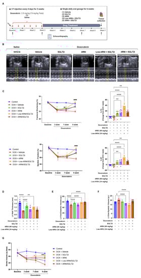 Furthermore, LV wall thinning after doxorubicin injection was significantly reduced in mice treated with either SGLT2i only or Low-ARNI/SGLT2i compared with that in doxorubicin + vehicle group (doxorubicin + vehicle: 0.99 ± 0.04 mm vs. doxorubicin + SGLT2i: 1.26 ± 0.08 mm, p < 0.001; doxorubicin + vehicle vs. doxorubicin + Low-ARNI/SGLT2i: 1.17 ± 0.05 mm, p < 0.01) (Figure 2D).