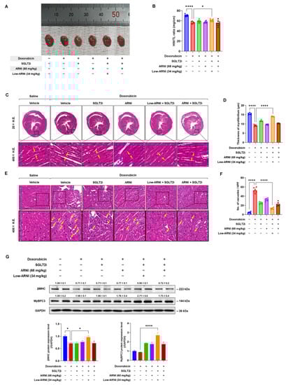 Protective effects of ARNI and SGLT2i treatment on doxorubicin-induced cardiotoxicity. (A) Whole-heart photograph. (B) The ratio of heart weight to tibia length (HW/TL) (n = 7–8/group). (C) Representative hematoxylin and eosin staining. (D) Quantitative myofibrillar thickness (n = 6–7/group) (E) Representative cytoplasmic vacuolization. (F) Quantitative number of cytoplasmic vacuoles (n = 6–7/group). (G) Representative immunoblots of βMHC, MyBPC3, and GAPDH and graphical quantification at 9 weeks after doxorubicin injection in indicated experimental groups (n = 4–5/group). * p < 0.05, **** p < 0.0001.