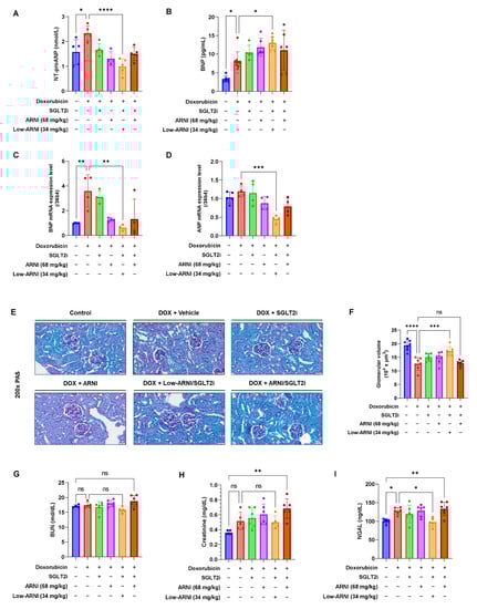 Effects of ARNI and SGLT2i treatment on heart-driven hormones in chronic doxorubicin-injected mice. (A) Plasma concentration of NT-proANP and (B) BNP 9 weeks after doxorubicin treatment initiation (n = 5–6/group). (C) mRNA expression of BNP and (D) ANP (n = 4–5/group). (E) Representative PAS staining of kidney cross-sections. (F) Quantitative mean glomerular volume (n = 6–7/group). (G) Plasma concentrations of BUN, (H) creatinine, and (I) NGAL 9 weeks after doxorubicin injection (n = 4–6/group). ns, no significance, * p < 0.05, ** p < 0.01, *** p < 0.001, **** p < 0.0001.