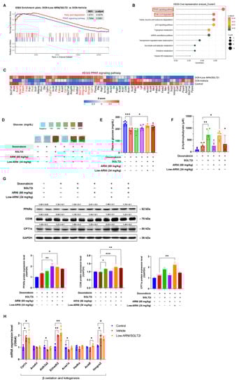 Effects of ARNI and SGLT2i treatment on cardiac energy metabolism in doxorubicin-induced cardiac injury. (A) GSEA plots associated with Low-ARNI/SGLT2i-treated groups. (B) Summary plot for over-representation analysis with Kyoto Encyclopedia of Genes and Genomes pathway of cluster 3 in hierarchical clustering. (C) Heat maps of relative mRNA expression of indicated genes in PPAR signaling pathway from control, doxorubicin + vehicle, and doxorubicin + Low-ARNI/SGLT2i groups. (D) Urine glucose, (E) plasma glucose and (F) plasma β-hydroxybutyrate levels (n = 5–7 per group). (G) Representative immunoblots of PPARα, CD36, and CPT1α protein at 9 weeks after doxorubicin injection in indicated experimental groups and graphical quantification (n = 4–5 per group) (H) mRNA levels of β-oxidation and ketogenesis-related genes are determined by qRT-PCR (n = 4 per group). * p < 0.05, ** p < 0.01, *** p < 0.001.