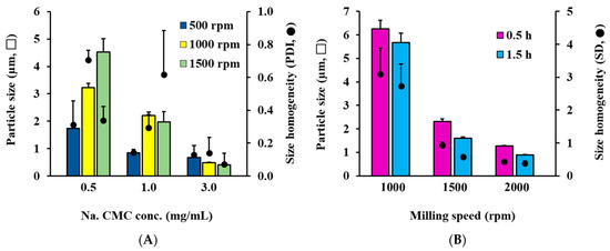 Effect of formulation and fabrication parameters on drug particle size and homogeneity in RTG-loaded injectable crystalline suspension. (A) Effect of Na. CMC concentration and bead-milling speed on drug particle size and homogeneity of the AS system. (B) Effect of bead-milling speed and milling time on crystal size and homogeneity of the OS system. Notes: The particle size and homogeneity of AS system were determined using dynamic light scattering method. On the other hand, for the RTG-OS, the size of the suspended RTG crystals was determined using a micrometer for 200 randomly selected RTG particles from light microscope images, with difficulty in analyzing hydrodynamic diameter with dynamic light scattering method (Zetasizer Nano®).