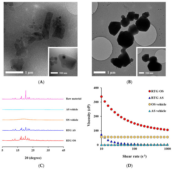 We designed two RTG crystalline suspensions (AS and OS) with comparable particle diameters, and characteristics of injectable suspensions were evaluated by aspect of morphology, drug content, crystal size, viscosity, and crystallinity (Table 3 and Figure 2). The particle sizes were adjusted to 853 nm for AS and 878 nm for OS, respectively, which is within the size range of marked crystalline injectable suspensions. The mean particle sizes of paliperidone palmitate (Invega sustenna®, Janssen, NJ, US), aripiprazole (Abilify maintena®, Otsuka Pharmaceutical Inc., Tokyo, Japan), rilpivirine suspensions (Cabenuva®, ViiV Healthcare, GL, Research Triangle, NC, UK), and olanzapine (Zyprexa Relprevv®, Eli Lilly, Indianapolis, IN, USA) was informed to be <1000 nm, 1–10 µm, <500 nm, and <3 µm, respectively [39,40,41,42]. The morphological features of the RTG nanocrystals suspended in aqueous or oily vehicles were examined by Cryo-TEM (Figure 2A,B). In both formulations, the crystals generally exhibited a rectangular or hexagonal crystalline form. Although the vehicles were different, the identical pulverization process provided a comparable crystalline shape. RTG concentrations in AS and OS were 100.9 mg/mL and 100.7 mg/mL, respectively, indicating no degradation of RTG during fabrication (Table 3). The amount of RTG dissolved in the OS was 19.6 mg/mL, which is markedly higher than AS (0.07 mg/mL), but over 80% of the initial load was suspended as solid state in the oily vehicle (Table 3).