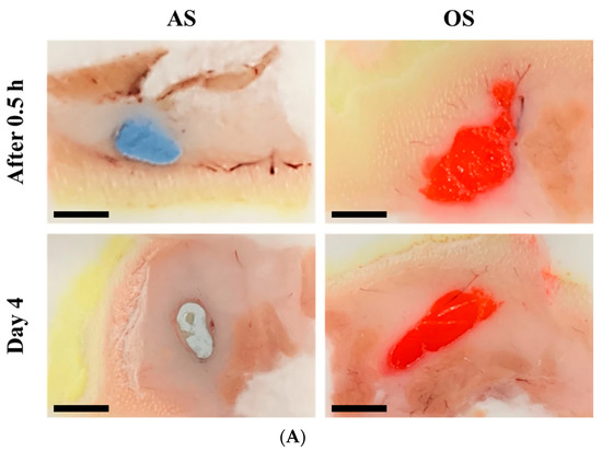 Macroscopic observations revealed a noticeable difference in the degree of drug aggregation and local inflammation between AS and OS (Figure 4A). Upon SC administration of AS, agglomeration of drug particle and the shape of closely packed clusters of particles in the tissue were observed. The increase in surface free energy due to the rapid absorption of the aqueous suspension vehicle might cause drug aggregation at the injection site. Conversely, no distinct drug aggregates were observed with OS, with the Sudan III-stained delivery vehicle spreading widely at the injection site (Figure 4A). Oily vehicles might be adsorbed onto the surface of the RTG particles, maintaining their suspended state at the injection site. Seven days post-dosing, white drug aggregates ranging from 5 to 10 mm and surrounding inflammatory cells and fibrous matrix were observed at the AS-injected site. In contrast, no marked drug aggregates were distinctively observed on the seventh day after OS injection, with the red-colored oily vehicle remaining at the injection site (Figure 4A). The prolonged retention of sesame oil, an oily vehicle, was consistent with previous findings that the elimination T1/2 of castor oil, fractionated coconut oil, isopropyl myristate, and sesame oil was approximately 20, 14, 20, and 23 days, respectively, after SC or IM injection in pigs [46]. Moreover, an oil depot composed of sesame oil and benzyl alcohol (9:1 v/v) was visible on histopathological evaluation, even 4 weeks after IM injection [47].