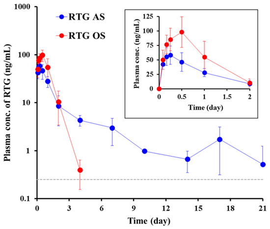 Plasma concentration-time profiles of RTG following SC injection of RTG AS (🔴) and RTG OS (🔵) in rats (30 mg/kg as RTG). Notes: Data are expressed as mean ± SD (n = 5). The dashed line (--) indicates the limit of quantitation (LOQ). The plasma concentration of RTG after AS or OS injection was below the LOQ after 28 and 7 days, respectively.