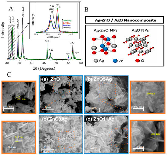 3.1. Structural and Morphological Properties of Ag-ZnO/AgO Nanocomposites