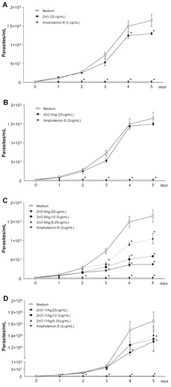- Do Carmo Neto, J.R.; Guerra, R.O.; Machado, J.R.; Silva, A.C.A.; da Silva, M.V. Antiprotozoal and Anthelmintic Activity of Zinc Oxide Nanoparticles. Curr. Med. Chem. 2022, 29, 2127–2141. [Google Scholar] [CrossRef]