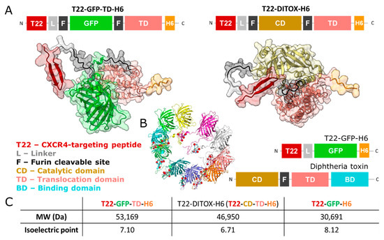 Modular organization of T22-empowered proteins. (A) Modular disposition and 3D models of T22-GFP-TD-H6 and T22-DITOX-H6. T22-GFP-TD-H6 was engineered to mimic the CXCR4-targeted toxin T22-DITOX-H6 through the replacement of the catalytic domain of the toxin (CD) by the green fluorescent protein (GFP). The translocation domain (TD) was maintained. Both proteins display, from the N to the C terminus, the CXCR4 ligand T22, a flexible linker (L; GGSSRSS), two furin cleavable sites (F; GNRVRRSV) recruited from the original DT, and the hexa-histidine tag (H6), all represented in color code. Furin cleavable sites have proved to be functional in this family of modular constructions [48]. Models in 3D were predicted in AlphaFold2 and represented with ChimeraX. (B) The modular disposition of the DT and T22-GFP-H6 are also shown as references. In the center is the T22-GFP-H6 nanoparticle as previously modelled [49], with each monomer represented in a different color and the stabilizing divalent cations as red spheres (reprinted from [49] with permission from Elsevier). (C) Molecular weight and isoelectric point of the three proteins used in this study, predicted by ProtParam (Expasy, http://web.expasy.org/protparam; accessed on 20 November 2022).