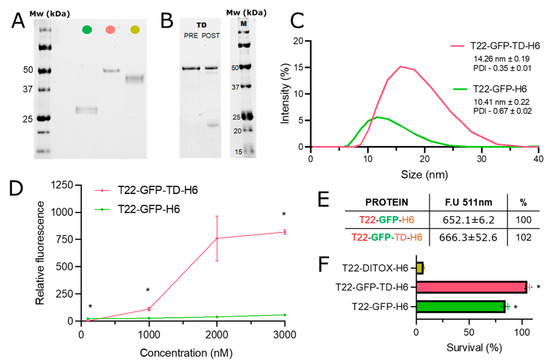 Characterization of T22-GFP-TD-H6 nanoparticles and their cellular accumulation. (A) Protein gel electrophoresis of the three proteins used in the study (T22-GFP-H6, in green; T22-GFP-TD-H6, in dark pink; T22-DITOX-H6, in dark yellow). (B) Protein gel electrophoresis of T22-GFP-TD-H6, before (pre) and after (post) exposure to recombinant furin. (C) Intensity size distribution of T22-GFP-H6 and T22-GFP-TD-H6, measured by Dynamic Light Scattering (DLS). Inset values indicate mean size measured by intensity (nm) and polydispersity index (PDI) ± standard error. (D) Relative intracellular accumulation of T22-GFP-H6 and T22-GFP-TD-H6 in HeLa cells after 24 h of exposure, at four different concentrations (100 nM, 1000 nM, 2000 nM, 3000 nM). Data are shown as mean ± standard error. Fluorescence values are referred to those of background cells. Significant statistical differences between data pairs (T22-GFP-H6 vs. T22-GFP-TD-H6 at a respective concentration) are represented by * at p < 0.05. (E) Intrinsic fluorescent emission of T22-GFP-H6 and T22-GFP-TD-H6, exciting at 488 nm and detecting at 511 nm. Fluorescence of T22-GFP-H6 is stated as 100%. (F) HeLa cell viability upon exposure to 1000 nM of T22-GFP-H6, T22-GFP-TD-H6 and T22-DITOX-H6 for 48 h. Data are shown as mean ± standard error. Statistical significance with respect to the toxin group (T22-DITOX-H6) is represented by * p < 0.05.