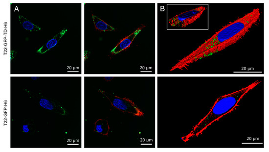 The dramatic protein accumulation linked to the incorporation of TD (note that T22-GFP-H6 and T22-GFP-TD-H6 differ only in this domain) was assessed by confocal microscopy. The images confirmed the higher levels of T22-GFP-TD-H6 when compared to T22-GFP-H6 (Figure 3A). While an important part of the protein was found intimately associated to the cell membrane, 3D confocal reconstructions revealed an intracellular localization of an important amount of material, differential when comparing protein versions (Figure 3B). Such localization was compatible, in both cases, with an endosomal localization of the material. Since no diffused fluorescence was observed in the cytoplasm, cytosolic release, if it occurred, was moderate and involved only a limited fraction of the engulfed protein. Again, cells did not show any sign of toxicity when exposed to any of these proteins (Figure 3A).