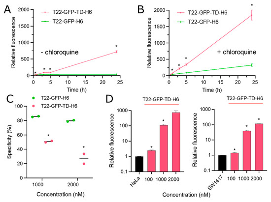 The potential of TD to enhance the endosomal escape of T22-GFP-H6 was further tested by using chloroquine as an indicator drug. Chloroquine minimizes lysosomal destruction of proteins by reducing acidification [58,59]. Subsequently, any increase in the intracellular florescence of the drug should be representative of the nominal proteolytic destruction of a given fluorescent polypeptide, because of its retention in the lysosome. As observed in kinetic internalization analyses (Figure 4A,B), chloroquine increases the intracellular amount of both T22-GFP-H6 and T22-GFP-TD-H6, indicating lysosomal proteolysis in both cases. Although slight differences between the internalization patterns of these proteins were observed in the drug, data were not sufficiently robust to infer an enhanced proteolytic stability in the TD-carrying protein. Again, according to the data shown in Figure 3, endosomal escape, if it occurred, was not a majoritarian event.