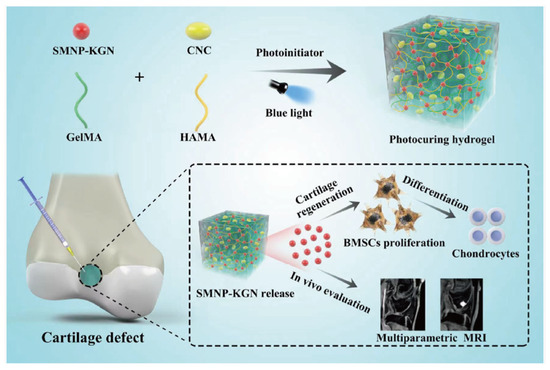 - Chen, C.; Huang, S.; Chen, Z.; Liu, Q.; Cai, Y.; Mei, Y.; Xu, Y.; Guo, R.; Yan, C. Kartogenin (KGN)/Synthetic Melanin Nanoparticles (SMNP) Loaded Theranostic Hydrogel Scaffold System for Multiparametric Magnetic Resonance Imaging Guided Cartilage Regeneration. Bioeng. Transl. Med. 2022; e10364, early view. [Google Scholar] [CrossRef]