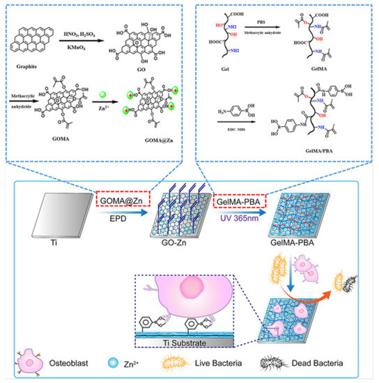 - Tao, B.; Chen, M.; Lin, C.; Lu, L.; Yuan, Z.; Liu, J.; Liao, Q.; Xia, Z.; Peng, Z.; Cai, K. Zn-Incorporation with Graphene Oxide on Ti Substrates Surface to Improve Osteogenic Activity and Inhibit Bacterial Adhesion. J. Biomed. Mater. Res. A 2019, 107, 2310–2326. [Google Scholar] [CrossRef]
