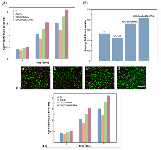 | Ti/GO-Zn/GelMA-PBA substrates | Cell differentiation and proliferation | Improve ALP activity, ECM mineralization, and genes or protein expression | [56] |