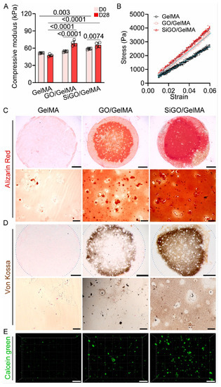 | GelMA-SiGO scaffold | Bone regeneration | Enhance bone regeneration proteins formation | [57] |