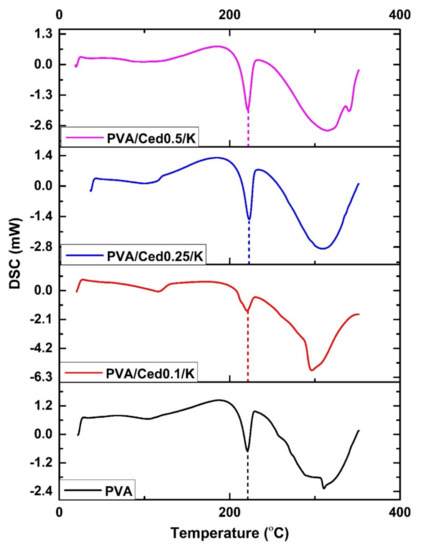 - Mohammed, G.; El Sayed, A.M.; Morsi, W.M. Spectroscopic, thermal, and electrical properties of MgO/polyvinyl pyrrolidone/polyvinyl alcohol nanocomposites. J. Phys. Chem. Solids 2018, 115, 238–247. [Google Scholar] [CrossRef]