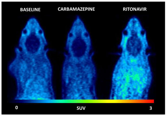 Representative PET summation images (from 0 to 30 min) of [11C]metoclopramide from one baseline rat and one rat pretreated with carbamazepine (45 mg/kg twice a day for 7 days before PET) or ritonavir (20 mg/kg, 3 h before PET).
