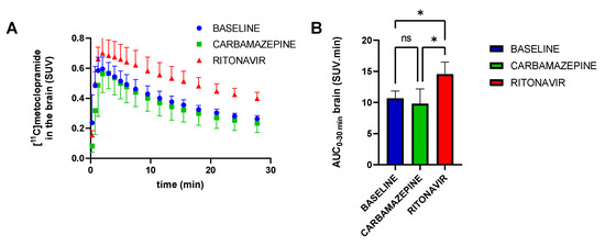 Whole-brain time–activity curves (A) and area under the whole brain curve from 0 to 30 min (AUC0–30 min, (B) for groups without (baseline) and with pretreatment with carbamazepine or ritonavir. Data are reported as mean ± S.D with n = 4 per condition. ns = not significant, * p < 0.05 (one-factor ANOVA and Tukey’s post hoc test for multiple comparisons).