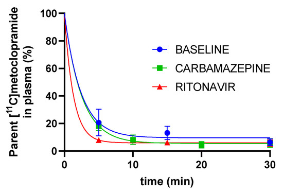 Fraction of parent (unmetabolized) [11C]metoclopramide in plasma over time without and with pretreatment with carbamazepine or ritonavir (mean ± S.D with n = 3 per condition).