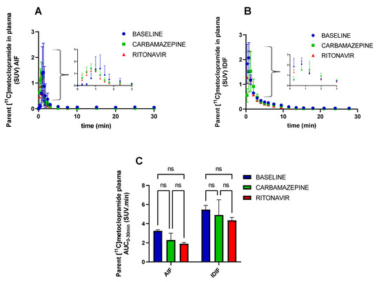 Concentration of parent (unmetabolized) [11C]metoclopramide in plasma over time determined from the sampled arterial input function (AIF, (A) or from the image-derived input function (IDIF, (B). In (C), the area under the curve from 0 to 30 min (AUC0–30 min) of parent [11C]metoclopramide in plasma is shown. Data are reported as mean ± S.D with n = 3 (AIF) or n = 4 (IDIF) per condition. ns = not significant (two-way ANOVA with Tukey’s post hoc test for multiple comparisons).