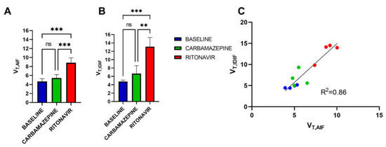 Brain volume of distribution (VT) of [11C]metoclopramide in groups without (baseline) and with pretreatment with carbamazepine or ritonavir determined with the arterial input function (VT,AIF, (A) or the image-derived input function (VT,IDIF, (B) and linear correlation between VT,IDIF and VT,AIF (C). Data are reported as mean ± S.D with n = 3 (AIF) or n = 4 (IDIF) per condition. *** p < 0.001, ** p < 0.01, ns = not significant (two-way ANOVA with Tukey’s post hoc test for multiple comparison).