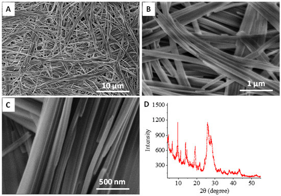(A–C) SEM images of M-BTC nanofibers at different magnifications; (D) The PDXR pattern of the M-BTC nanofibers.