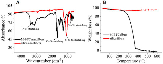 FTIR spectra of M-BTC nanofibers and silica nanofibers (A) and TGA curves of M-BTC nanofibers and silica nanofibers (B).