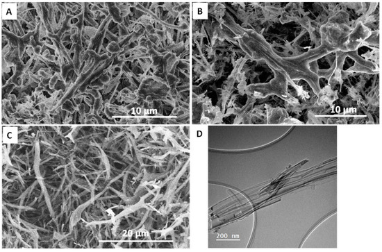 Figure 3A shows the silica-coated M-BTC fibers prepared with 4 w/v% silica sol. The fibrous structure can still be observed, although there are features of silica particles/aggregates. After calcination, a similar fibrous structure is obtained (Figure 3B). This suggests the complete coating of M-BTC fibers. It is understandable that the TEOS concentration in the silica sol can affect the coating. A less concentrated silica sol can, in principle, lead to a thinner coating on the organic fibers. This has been demonstrated by the use of 0.8 w/v% silica sol. From Figure 3C, one can see the composite fibers are very similar to the M-BTC fibers. This indicates a thin and uniform coating of silica, without the formation of silica mass between the fibers. This is further demonstrated by the hollow silica nanofibers shown by TEM imaging in Figure 3D. The hollow nanofibers (around 50 nm, consistent with individual M-BTC nanofibers in Figure 1C) aggregate together to form the fibrous morphology as seen in Figure 3C. Silica nanofibers prepared by electrospinning generally show smooth surface morphology, with individual nanofibers separating from each other [20,26,27]. For the nanofibers produced in this work, they are randomly positioned and are observed to be connected by additional silica, which may provide easily accessible porosity and good mechanical stability. For both methods, it is possible to incorporate surfactant templates to tune surface area and mesoporosity in the amorphous silica framework.