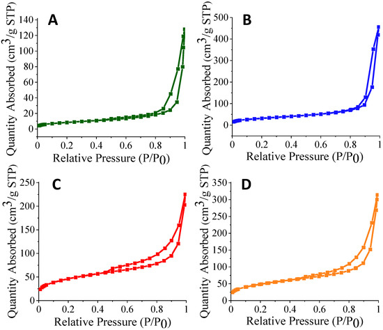 N2 sorption isotherms of silica nanofibers without CTAB (A), and silica nanofibers produced by 1.4 wt% CTAB (B), 2.0 wt% CTAB (C), as well as 2.6 wt% CTAB (D).