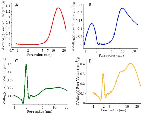 Pore size distribution of silica nanofibers, based on N2 desorption branch, prepared (A) without CTAB, (B) 1.4 wt% CTAB, (C) 2.0 wt% CTAB, and (D) 2.6 wt% CTAB.
