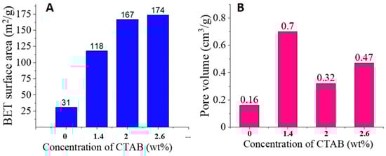 As shown in Figure 6A, the Brunauer–Emmett–Teller (BET) surface area increases with the increase of CTAB concentration. There is a bigger increase between that without CTAB (concentration = 0) and CTAB concentration 1.4 wt%. The increase in surface area is slowed down with the further increase of CTAB. For the pore volume, it is highest when the CTAB concentration is 1.4 wt% (Figure 6B), a very big jump from CTAB concentration = 0. However, further increase of CTAB concentration leads to a decrease in pore volume. These results demonstrate the effectiveness of CTAB templating (e.g., when CTAB concentration is 1.4 wt%), and the complexity of CTAB templating with increased CTAB concentration and the presence of M-BTC fibers as another template. The larger aggregates of CTAB at higher concentrations and the possible interaction with M-BTC fiber surface could lead to the results shown in Figure 4, Figure 5 and Figure 6.