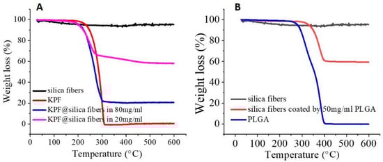 TGA profiles of (A) Silica nanofibers, KPF and KPF-loaded silica nanofibers; (B) Silica nanofibers, PLGA, and PLGA-coated silica nanofibers.