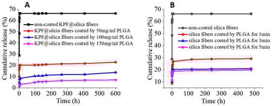 Cumulative release of KPF from (A) silica nanofibers with PLGA coating prepared at different PLGA concentrations (coating time 3 min) and (B) at different PLGA coating times (concentration 50 mg/mL).