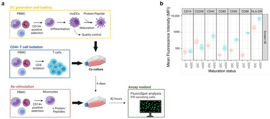 The DC:CD4+ T cell restimulation assay. (a) Experimental setup of the DC:CD4+ re-stimulation assay. The assay starts with the isolation of monocytes from healthy donor PBMCs, followed by the loading of the protein of interest and maturation of the monocyte derived Dendritic Cells (moDC). Autologous CD4+ T cells are isolated and co-cultured with the loaded moDCs. After an incubation of 6 days, freshly isolated monocytes are challenged with the same protein and added to the co-culture for an additional 42 h before analyzing the production of IFN-γ by FluoroSpot. (b) DC were characterized by the expression of the following cell surface markers: CD11c, CD14, CD80, CD83, CD86, CD209, and HLA-DR before and after DC activation by addition of TNF-α and IL-1β to ensure good cell fitness. Created with BioRender.com, accessed on 27 November 2022.