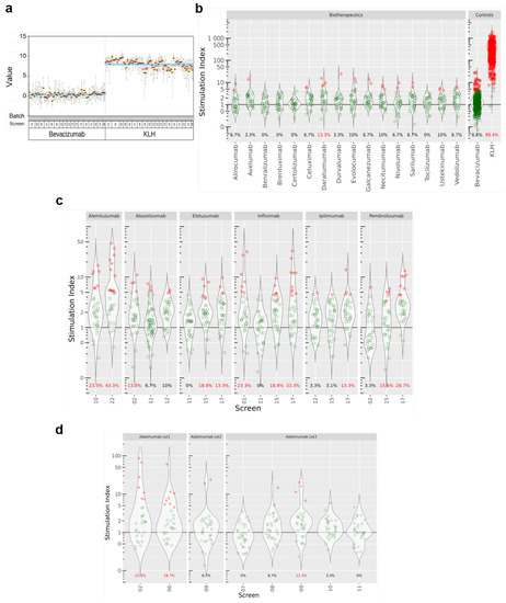 Results are summarized in Figure 2b,c. Most of the tested biopharmaceuticals elicited low levels of IFN-γ release (alirocumab, avelumab, benralizumab, bevacizumab, brentuximab, certolizumab, cetuximab, durvalumab, evolocumab, galcanezumab, necitumumab, nivolumab, sarilumab, tocilizumab, ustekinumab, vedolizumab). However, we saw stronger T cell responses with alemtuzumab, elotuzumab, pembrolizumab, infliximab, and daratumumab, for which more than 10% of the donors showed a SI statistically significant above 2. Interestingly, antibodies with identical modes of action (i.e., infliximab, adalimumab, and certolizumab all target TNF-α) triggered different T cell responses with regards to IFN-γ production. In addition, when compounds were tested several times in different screens, we observed that SIs and the derived response rates showed a significant variability (Figure 2c). We observed that for adalimumab, for which screens 02 and 06 resulted in 23.3% and 26.7% of positive donors, respectively, whereas it dropped to 0% in screen 07. These discrepancies are seen for pembrolizumab, atezolizumab, and elotuzumab, as well. One explanation for this observation could be a compound batch effect, as illustrated for adalimumab in Figure 2d.