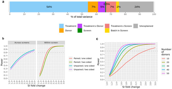 The breakdown of the SI readouts into individual variance components enables us to simulate data sets with specified effect sizes for hypothetical treatments. Hence, we can estimate the statistical power (i.e., the probability of detecting a true compound effect) in a wide range of conditions. For example, Figure 3b shows the resulting statistical power when comparing a compound SI fold-change response with the one of a reference or comparator treatment; here, we differentiate the case where both compounds of interest were assessed in the same screen, in contrast to a comparison that was conducted across different screens. A major advantage of a within-screen comparison is that one could apply paired testing (i.e., using ‘donor’ as a covariate) to yield higher statistical power because the donor-to-donor variability would be partially accounted for in this approach. This is, in our opinion, the recommended setting for a compound ranking study. Moreover, depending on the hypothesis of interest, some additional statistical power may be gained by using a one-sided testing approach. This is legitimate when only a higher (or lower) compound response is of interest as compared to a reference treatment, which, in fact, could be the most relevant scenario. As a rule of thumb, we expect that SI differences of about 75% on a linear scale (i.e., a SI fold-change of 1.75 or 0.8 log2 units) can be detected with a statistical power of 80%, assuming one-sided testing within the same screen, alpha = 0.05, and n = 30 donors.