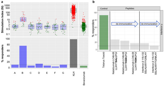 Case studies in pre-clinical research. (a) Stimulation Index (SI) obtained for 7 different candidate compounds of the same project (named A to G). The change in color, from green to red, depicts the positivity of the donor within the screen. The lower panel represents the proportion of positive donors. The threshold derived from the validation study is set at 10% positive donors. (b) DC:CD4+ re-stimulation results obtained for a selection of known T cell epitopes derived from biotherapeutics and their “de-immunized” counterparts.