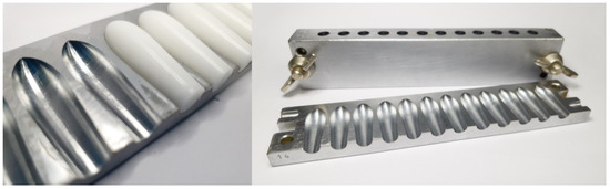 For the manufacturing of PEG-based suppositories, a mixture of PEG 6000 and PEG 400 (75 parts + 25 parts) was melted on the water bath at approximately 70 °C and stirred with 10% (w/w) paracetamol to a clear melt without any air bubbles. This melt was carefully poured into a metallic mold with torpedo-shaped holes (Figure 1) to avoid air inclusions. After hardening at room temperature, the suppositories were removed from the mold.