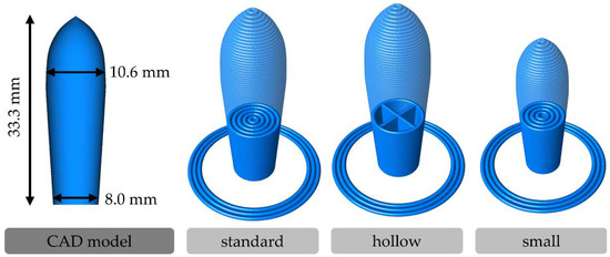 The “standard” design is based on the external contour of the torpedo-shaped holes in the metal mold used in the molding technique. A digital reconstruction of this shape was modeled using the computer-aided design (CAD) software FreeCAD 0.18 (https://www.freecad.org, released on 26 October 2019). These “standard” suppositories were printed completely filled with concentric printing lines. The “hollow” design has the same external shape but consists of only one printing line for the contour and single cross-shaped lines as an internal structure. Four air-filled sections are inside these suppositories terminated by two bottom layers. Furthermore, the “standard” design was downsized to 82.7% of the size in each orientation axis to generate a “small” design. The required material amount for these completely filled “small” suppositories should be quite similar to that of the “hollow” suppositories.