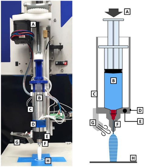 Photographic and schematic image of the 3D printer equipped for semi-solid 3D printing: (A) force on syringe piston applied by a motorized threaded rod, (B) 10 mL syringe filled with drug-loaded suppository base, (C) heatable metal cylinder, (D) thermistor, (E) heat cartridge, (F) heated nozzle, (G) cooling fan, (H) printing plate equipped with blue tape.