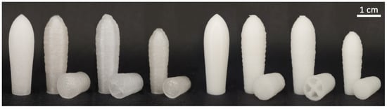 Furthermore, the printing process for samples of each suppository design was terminated at a height of 15 mm to obtain insights into the internal structure of the suppositories without the necessity to destroy the suppositories, which may be associated with structural changes.