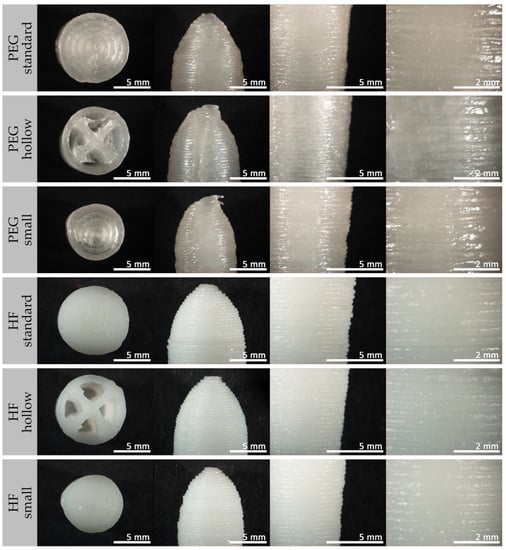 An interruption of the homogeneous surface of all 3D printed suppositories was visible at the starting point of each new layer, resulting in a vertical seam (compare Figure 5, PEG “hollow”, tip image). In addition, the outer points of the internal lines of the hollow suppositories, each representing a starting and an end point, were slightly thickened, and parts of the material were wiped into threads due to the interrupted extrusion with simultaneous rapid movements of the print head. A shift in the final printing layers at the tip of the suppositories was very recognizable for PEG suppositories but only minimally expressed for HF suppositories.