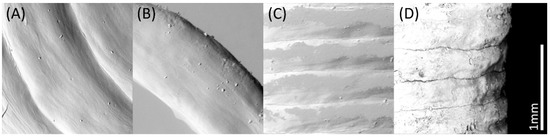 Scanning electron microscopic image of 3D printed suppositories based on PEG containing paracetamol. Top view of printed layers of completely filled printed “standard” suppository (A) and single print line of “hollow” suppository (B); frontal view of printing lines (C) and their contour (D).