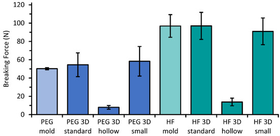 The completely filled suppositories of PEG and HF withstood similar forces before fracturing with values of 50–58 N and 91–97 N on average, respectively, independently of their size or manufacturing technique by molding or 3D printing (Figure 7). Lower forces of 8 ± 2 N or 14 ± 4 N induced the breakage of the “hollow” suppositories. Nevertheless, all suppositories including the “hollow” suppositories were easy to handle, and no care had to be taken during all performed tests.