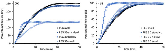 Paracetamol release profiles of molded and 3D printed (“standard”, “hollow”, and “small” design) suppositories based on PEG; mean ± SD, n = 6. Diagram (A) shows the cumulative amount of the released drug as mass and diagram (B) as the proportion of the expected total amount of 10% (w/w) paracetamol of the individual suppository mass.