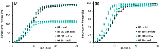 The release of paracetamol from the HF suppositories was much faster than from PEG suppositories; 80% of the expected total paracetamol amount was released after 8 to 13 min, with the “hollow” suppositories being the fastest. Furthermore, the profile of released paracetamol masses was quite similar for all suppository designs, and release rates increased after a few minutes.