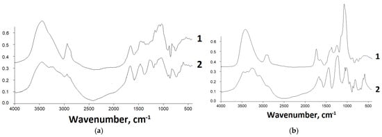 IR spectra for (a) GM and (b) GGM ((1) initial and (2) sulfated).