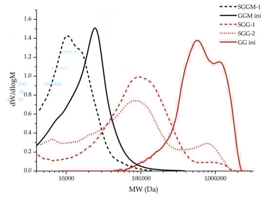 The initial GM sample has low molecular weight (Mw ≈ 660 kDa), which is consistent with the data reported in [30,34]. After sulfation for 150 min at 80 °C, the destruction of GM chains and molecular weight redistribution probably occur in the sample: the low-molecular peak of the fraction with MM ≈ 600 kDa disappears and a new peak corresponding to the reaction product with MM ≈130 kDa arises. The high-molecular-weight fraction in the sample also noticeably decreases (see Figure 2). An increase in the sulfation temperature to 80 °C leads to the further degradation of the GM polymer chains with a decrease in the MM of the main fraction of the sulfated product to ~110 kDa, while the high-molecular-weight fraction, on the contrary, somewhat increases, probably due to the higher resistance of molecules to the degradation and an increase in the GM sulfation degree. The molecular weight redistribution leads to an increase in the polydispersity index from 2.75 to 4.78.