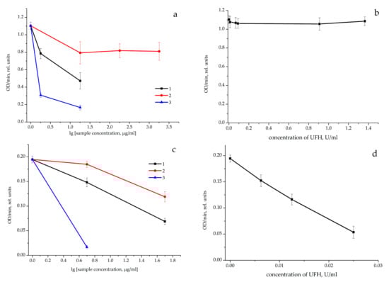 Effect of (a,c) the GGM/GM sulfates and (b,d) UFH on the optical density variation (OD/min, rel. units) of the solution containing (a,b) thrombin and chromogenic substrate (n = 3–4) or (c,d) thrombin, antithrombin, and chromogenic substrate (n = 3–6). (1) SGGM, (2) SGM-1, and (3) SGM-2.