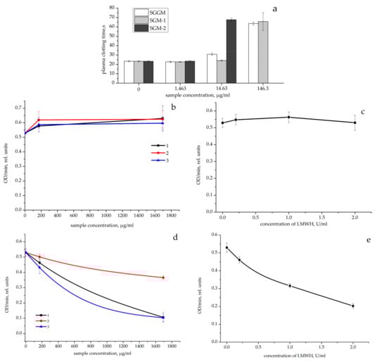 Effect of the GGM/GM sulfates on the plasma clotting time (s) in the ReaClot-Heparin test (a) (n = 6). Effect of (b,d) the GGM/GM sulfates and (c,e) LMWH on the optical density variation (OD/min, rel. units) in the solution containing factor Xa, the chromogenic substrate (b,c; n = 6) or factor Xa, the antithrombin, chromogenic substrate (d,e; n = 6). (1) SGGM, (2) SGM-1, and (3) SGM-2.